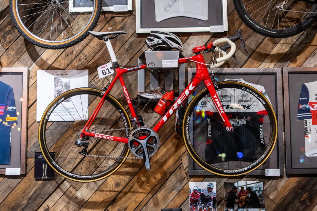 Współczesne perełki: Wojtek regularnie dołącza do ekspozycji swoje aktualne rowery, na których obecnie jeździ – w tym chromowaną Madone najnowszej generacji z napędem 1×13 i oponami Pirelli 35mm, która jest prawie gravelem!