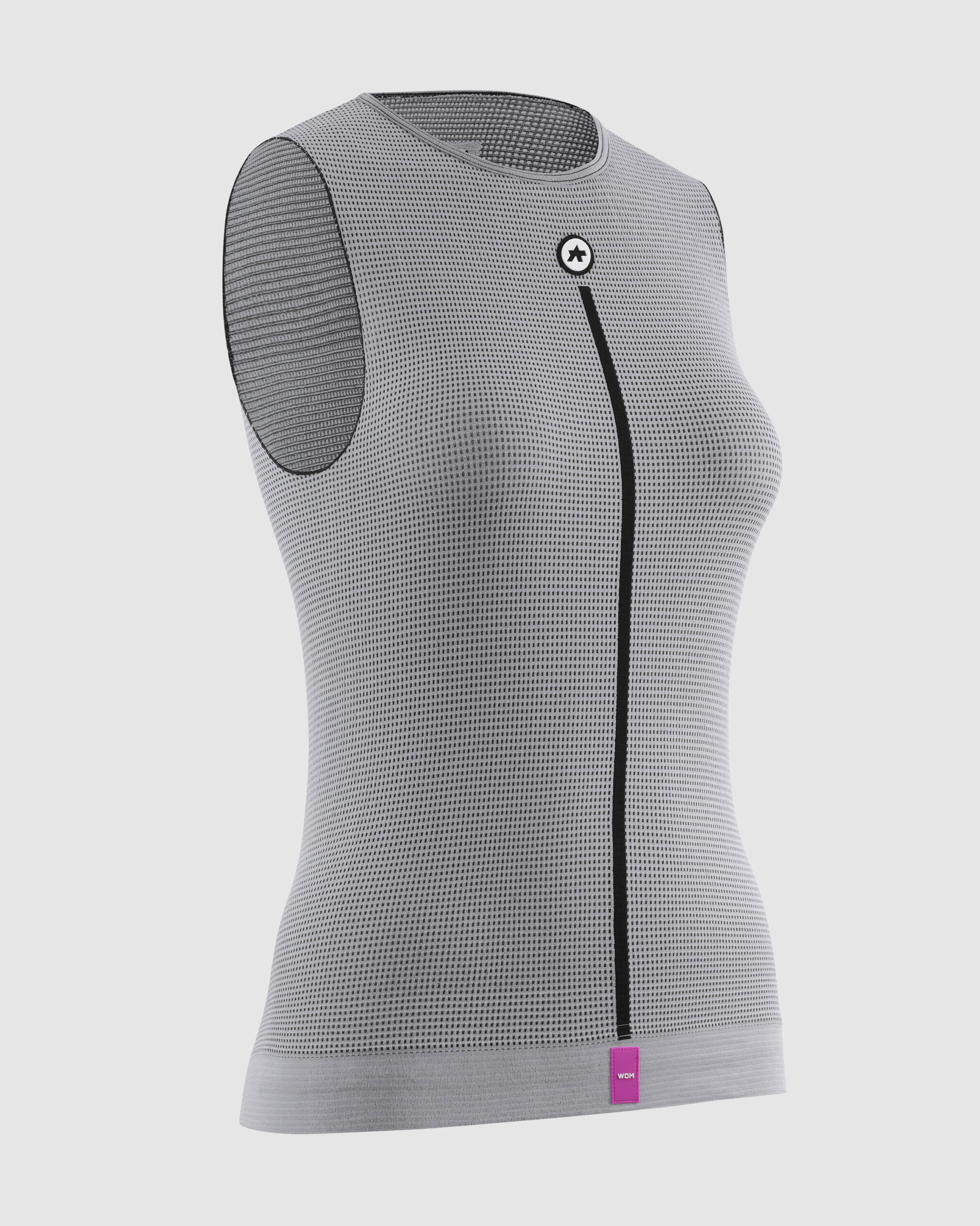 Damski podkoszulek rowerowy ASSOS Summer NS Skin Layer P1 to ultralekka warstwa bazowa bez rękawów o kobiecym kroju i bezszwowej konstrukcji. Wykonana z zaawansowanej, szybkoschnącej mieszanki przędzy polipropylenowej i karbonowej, skutecznie odprowadza wilgoć od skóry zapewniając idealną wentylację. Jej anatomiczny krój „second-skin” gwarantuje idealne dopasowanie pod koszulką kolarską, nie krępuje ruchów i nie powoduje otarć.
