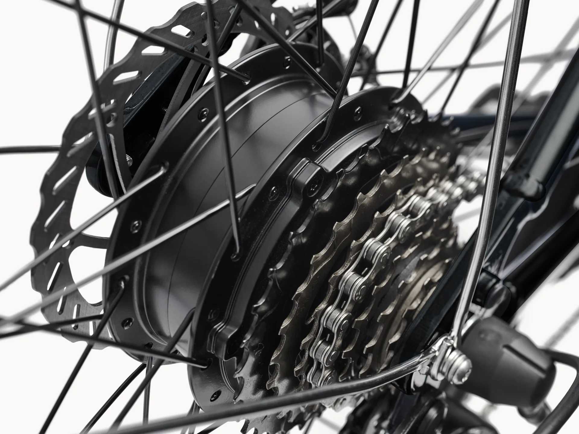 System napędowy dla rowerów elektrycznych Electra umożliwia pewną i w pełni kontrolowaną jazdę, dzięki trzem trybom wspomagania silnika w piaście tylnej oraz połączeniu z 7-biegową przerzutką zwiększającą zasięg. Szersze opony 700x40c pracują razem z hamulcami tarczowymi flat mount, by umożliwić szybsze i bezpieczniejsze hamowanie.