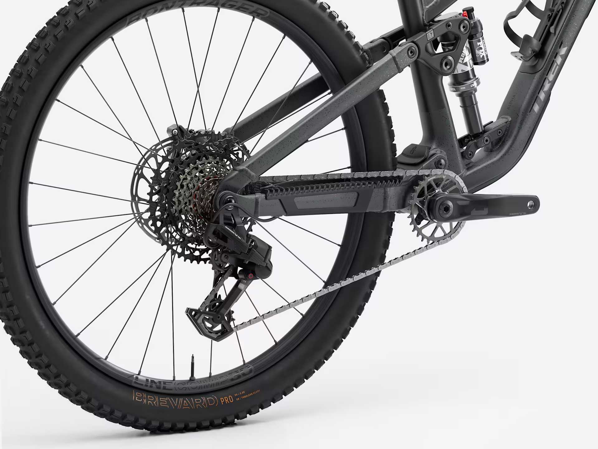 Napęd SRAM Eagle 70 oferuje szeroki zakres przełożeń i płynną zmianę biegów, także pod dużym obciążeniem. Dzięki temu Fuel EX 8 Gen 7 świetnie radzi sobie na stromych podjazdach i szybkich odcinkach. Wytrzymałe koła Bontrager Line z aluminium zapewniają odpowiednią sztywność i odporność na intensywne użytkowanie w trudnym terenie.