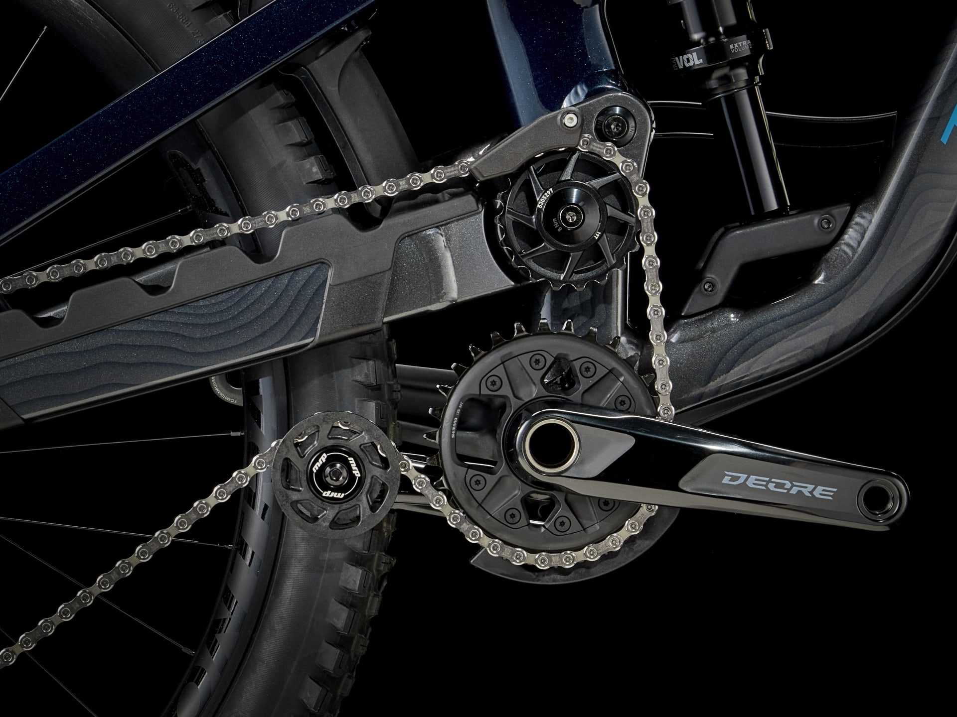 Rama z aluminium Alpha Platinum z zawieszeniem z wysokim punktem obrotu i kółkiem napinającym, a także dodatkowym miejscem na przechowywanie wewnętrzne. 170 mm skoku z przodu i z tyłu dzięki zastosowaniu widelca FOX Rhythm 36 ze sprężyną powietrzną Float EVOL i damperem GRIP oraz amortyzacji Fox Performance Float X. Mnóstwo biegów do łatwiejszej wspinaczki dzięki napędowi Shimano XT, sztyca regulowana Bontrager Line Dropper i zestaw mieszanych kół Bontrager Line Comp 30, 29 cali z przodu i 27,5 cala z tyłu, do zastosowań bezdętkowych z piastą Rapid Drive.