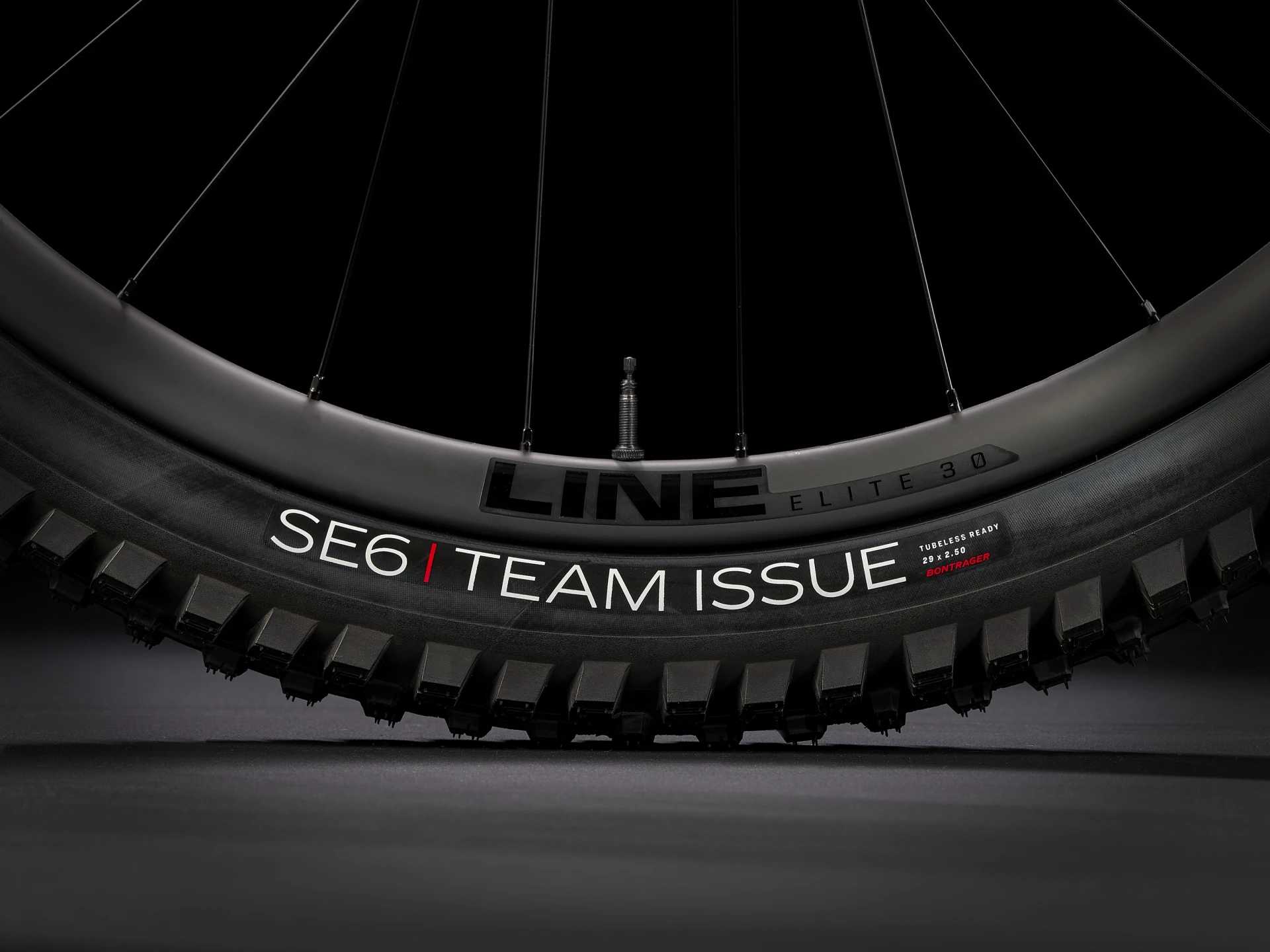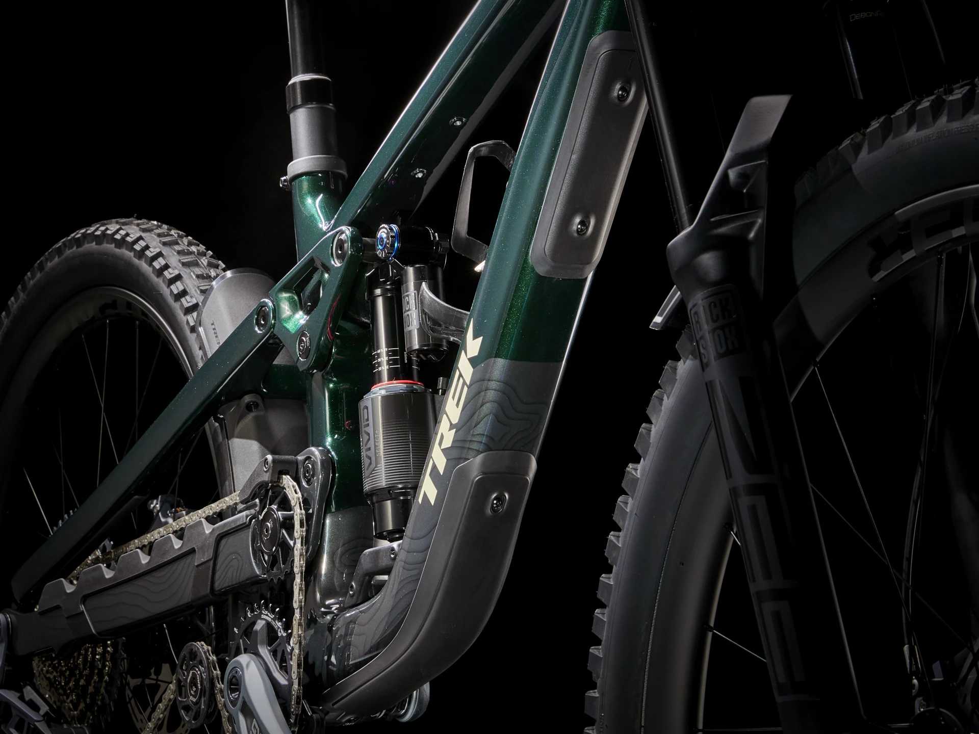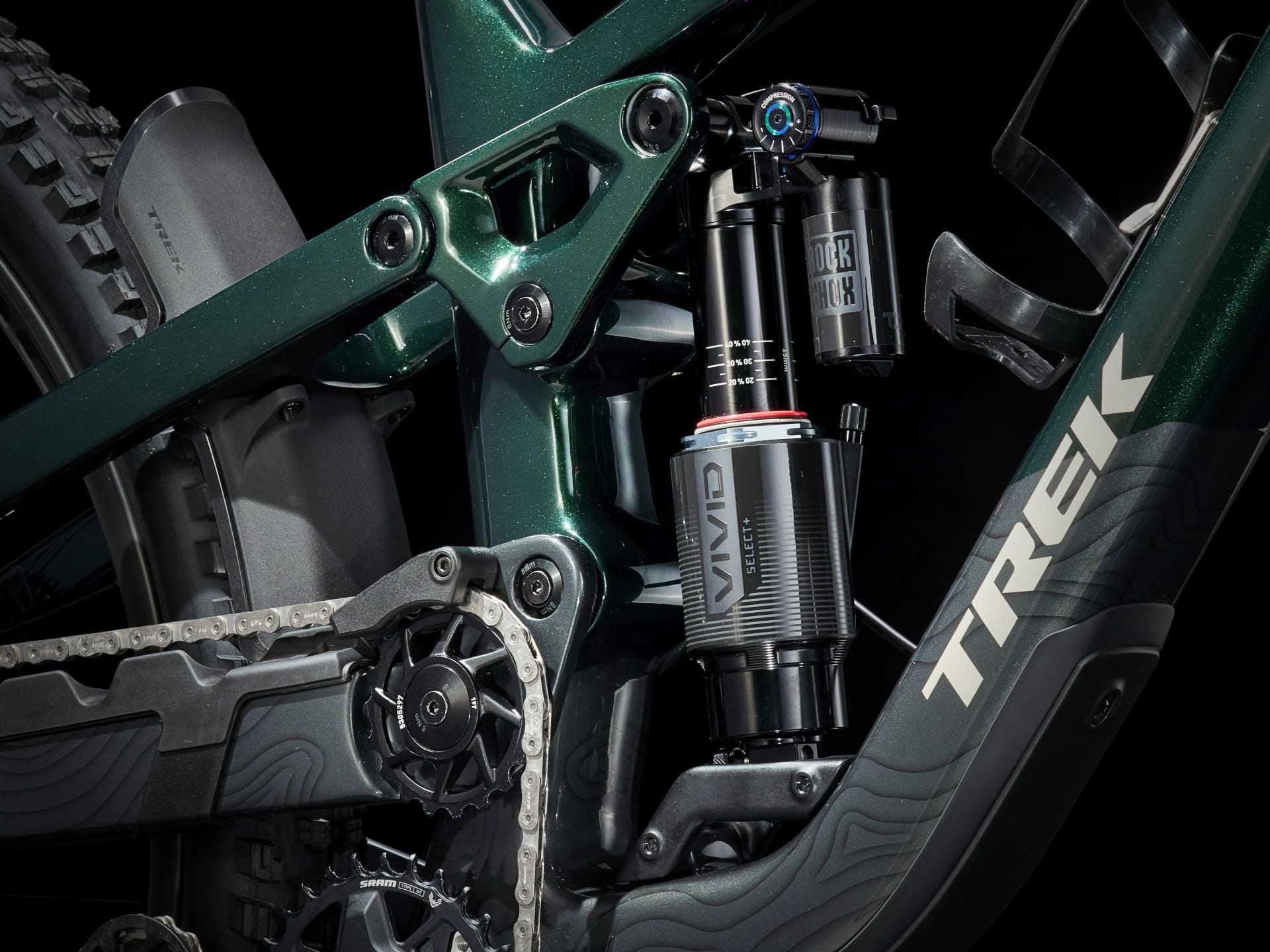 Rama z włókna węglowego OCLV Mountain z zawieszeniem z wysokim punktem obrotu i kółkiem napinającym, a także dodatkowym miejscem na przechowywanie wewnętrzne. Przedni i tylny skok 170 mm z widelcem RockShox ZEB Select+ ze sprężyną DebonAir i damperem Charger 3 RC2 oraz amortyzatorem RockShox Super Deluxe Select+. Mnóstwo biegów do łatwiejszej wspinaczki dzięki bezprzewodowemu napędowi SRAM GX AXS Transmission, sztyca regulowana Bontrager Line Dropper i zestaw mieszanych kół karbonowych Bontrager Line Elite 30, 29 cali z przodu i 27,5 cala z tyłu, do zastosowań bezdętkowych z piastą Rapid Drive.