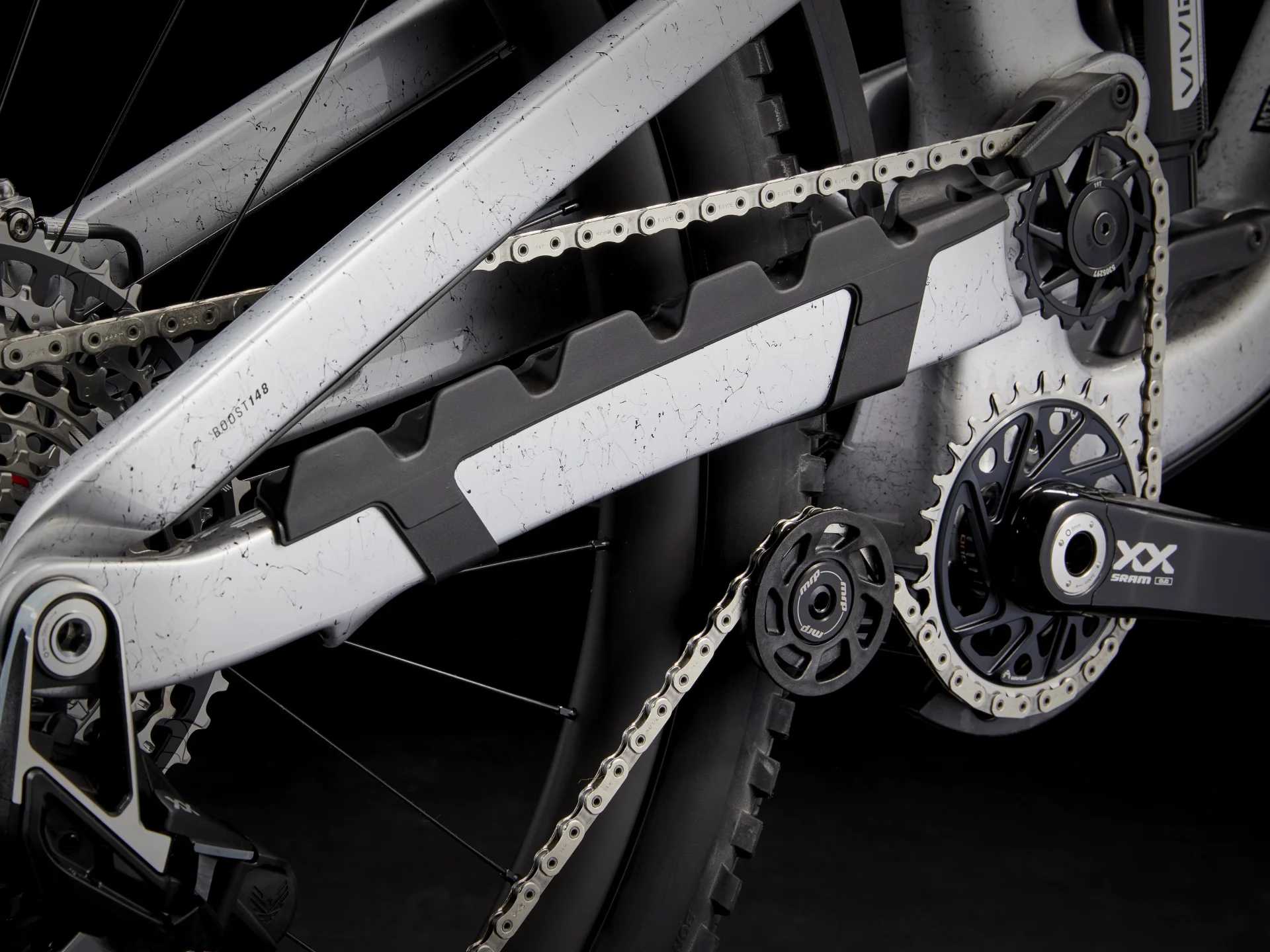 1. Zawieszenie z wysokim punktem obrotu daje Ci niesamowitą kontrolę na przeraźliwie stromych zjazdach, podczas gdy precyzyjnie dopasowany anti-squat i kółka przerzutki oversized niesamowicie zwiększają wydajność pedałowania