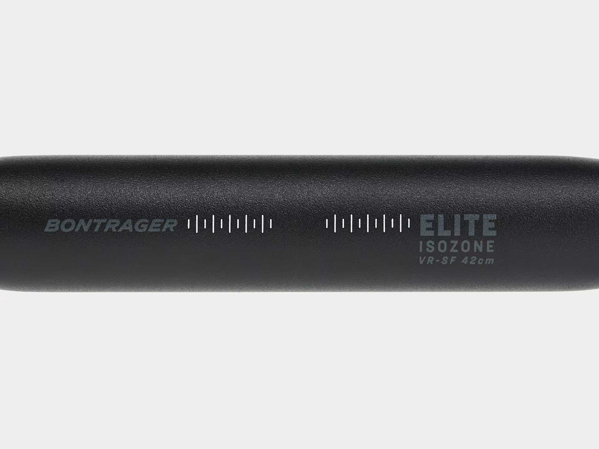 Aluminiowa kierownica szosowa Bontrager Elite IsoZone VR-SF 380mm/400mm z nakładkami IsoZone eliminującymi drgania oraz z lekkim rozszerzeniem zapewniającym więcej miejsca na nadgarstki.