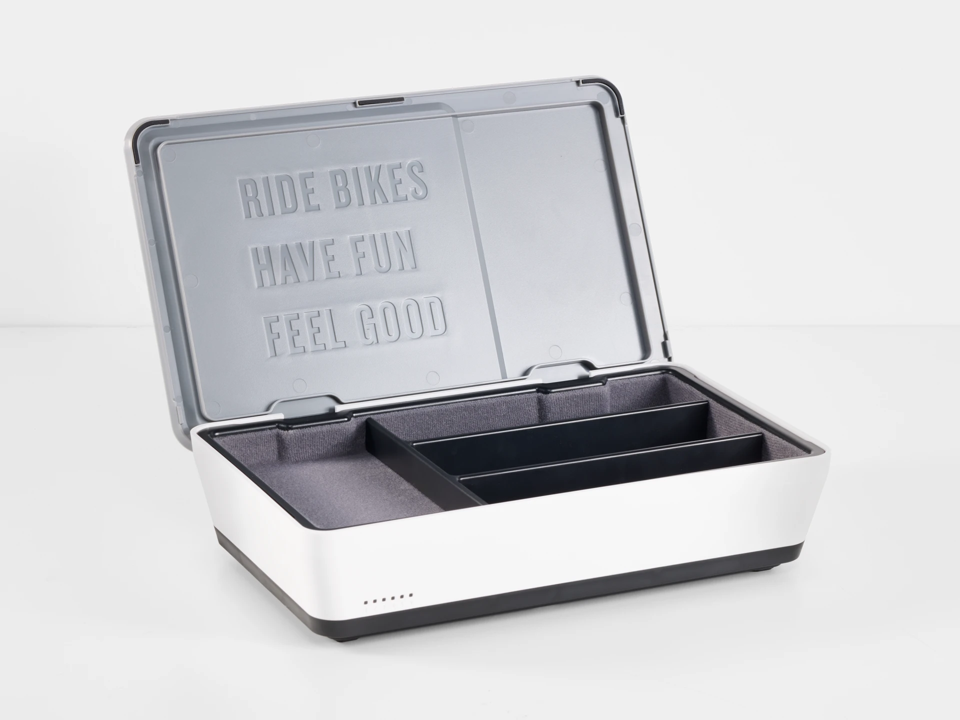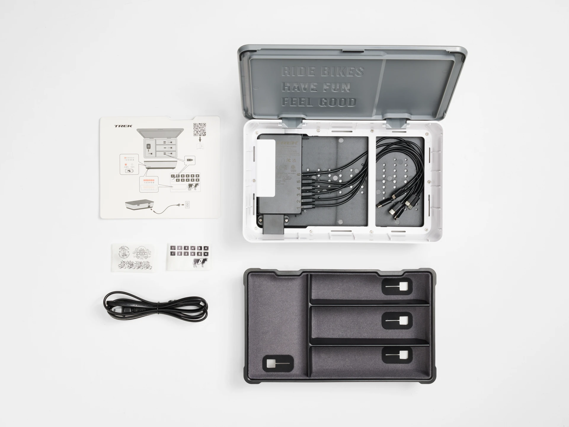 Stacja ładowania Trek CHRGtime to prostszy sposób na ładowanie wszystkich Twoich akcesoriów rowerowych. Z łatwością ładuj aż do sześciu lampek, komputerów i innych urądzeń rowerowych w wyrafinowanej obudowie, która pozwoli Ci uporządkować miejsce do ich ładowania, a także pozwala schludnie ukryć wszystkie przewody ładowania USB i USB-C.